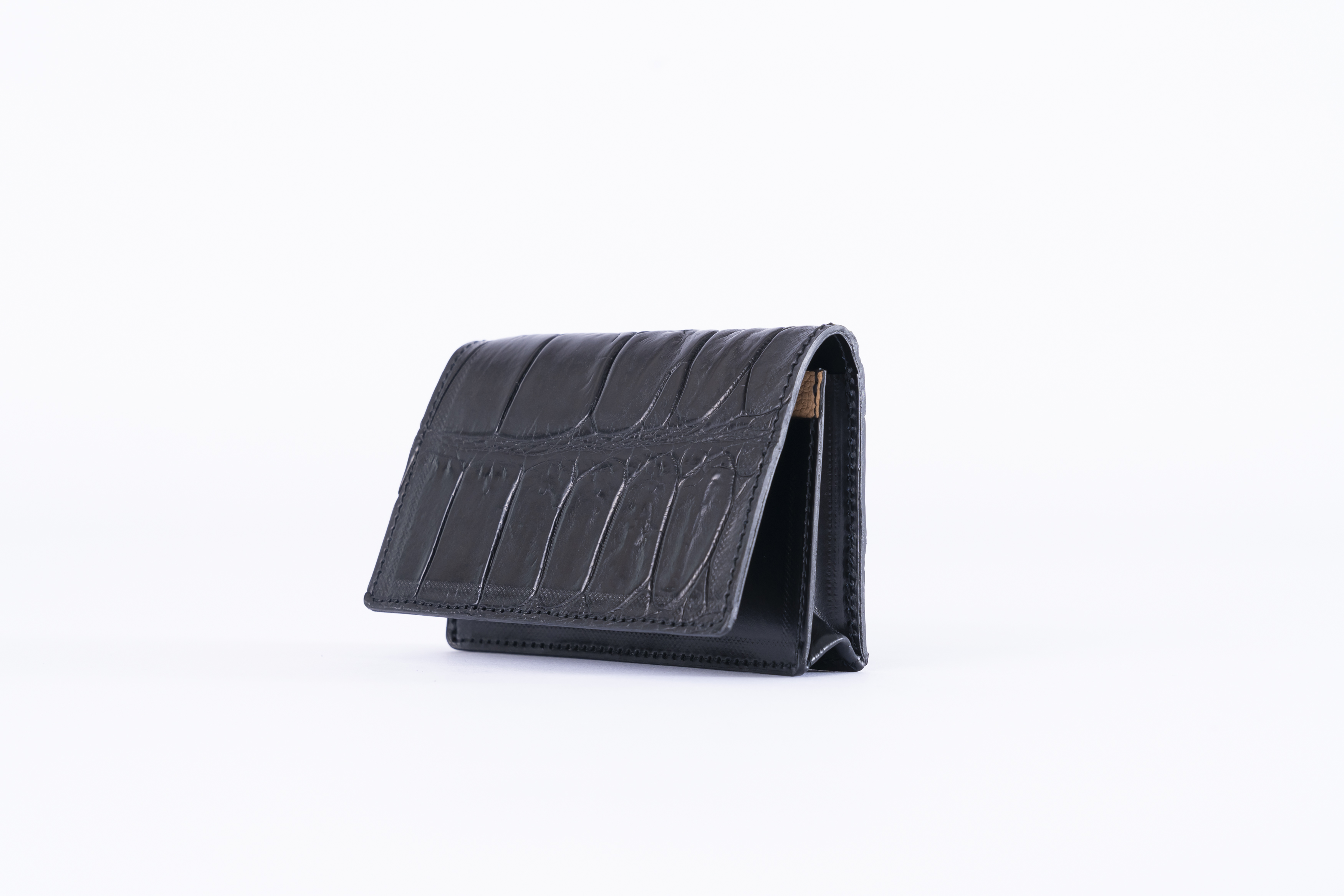 大胆で印象的なデザインクロコダイル型押しレザー。 その洗練された個性は、一度見たら忘れられない名刺入れ。 ビジネスシーンに似合う、すっきりとした外見。 けれども内装のポケット部分には、気持ちが上を向くよう 工夫を凝らした。