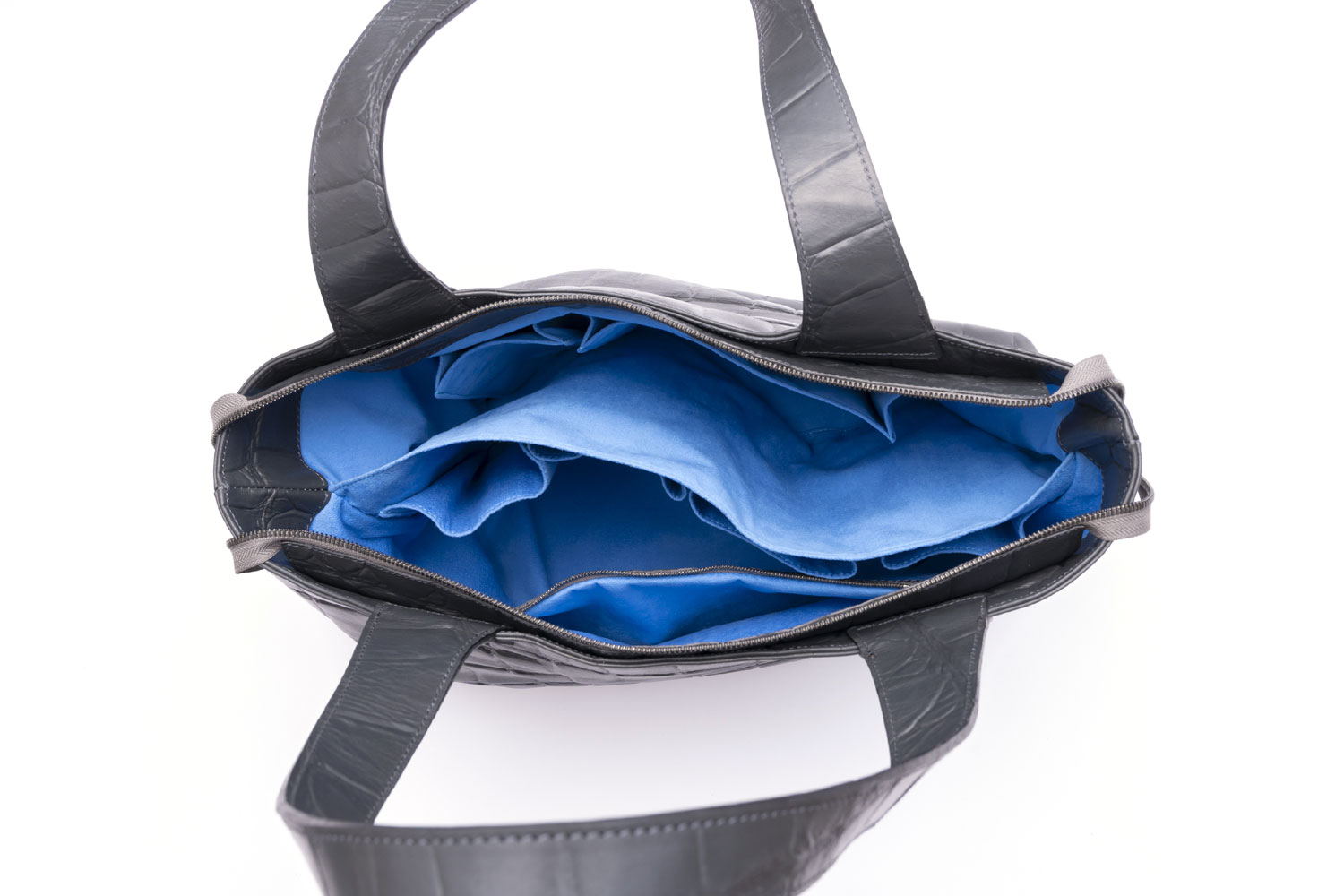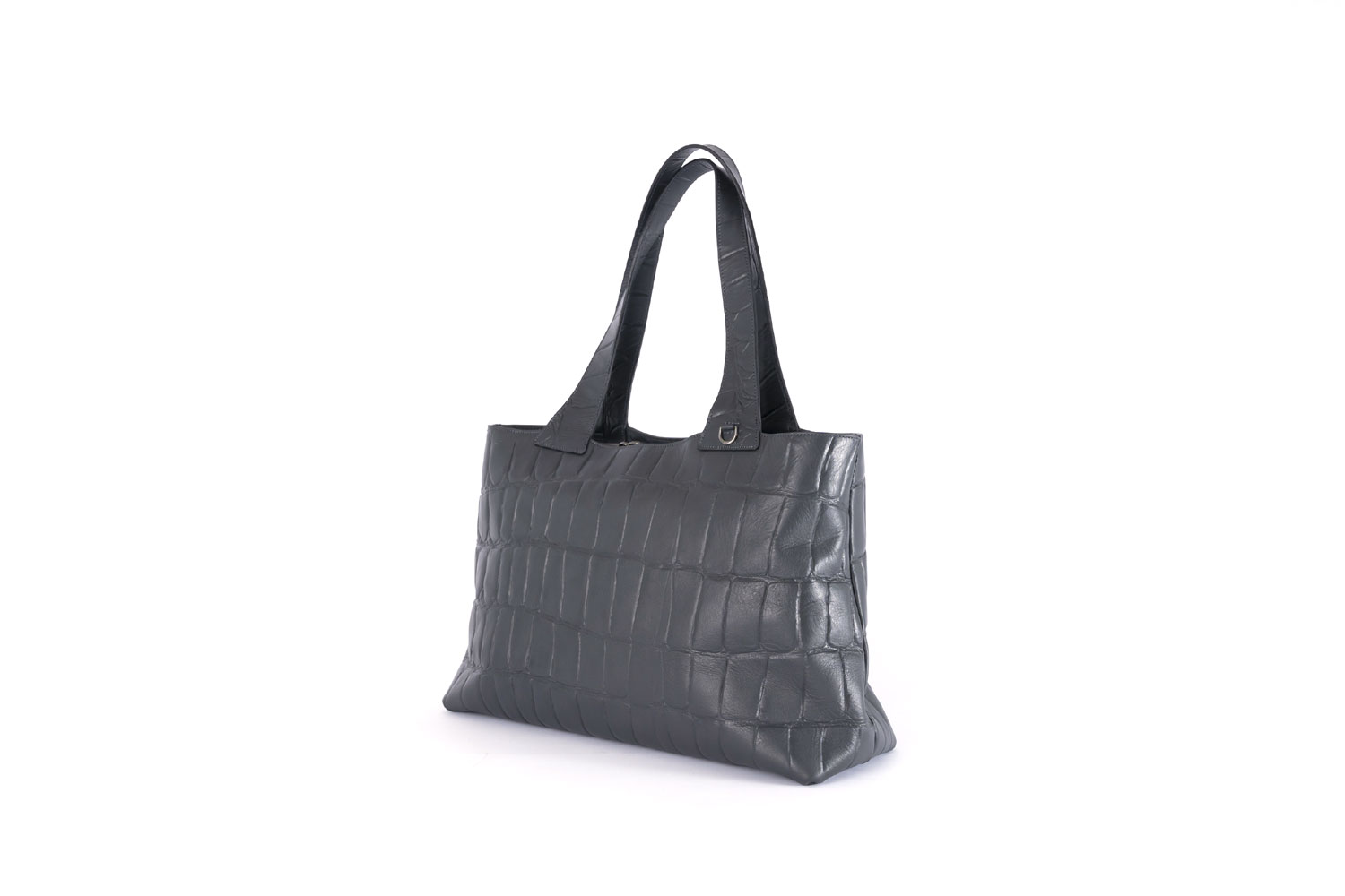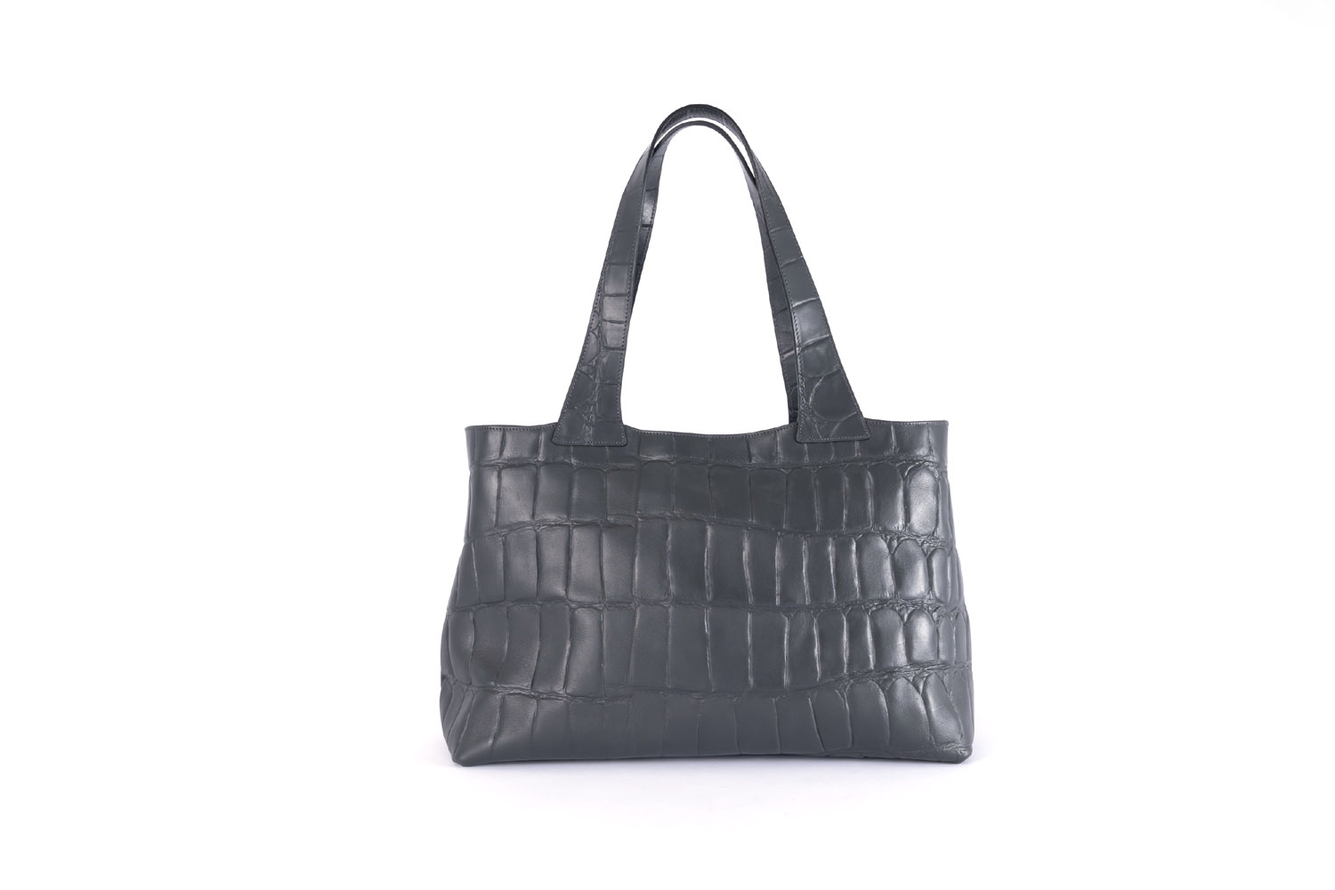 ムラ感の美しいクロコダイル型押しレザーを使用した トートバッグです。 ベーシックなデザインに力強さを加え、エレガントなデザイン、 色味にこだわった一品。内側にはポケットが多数付いているため 小物類を容易に小分けが可能。容量も申し分ない。