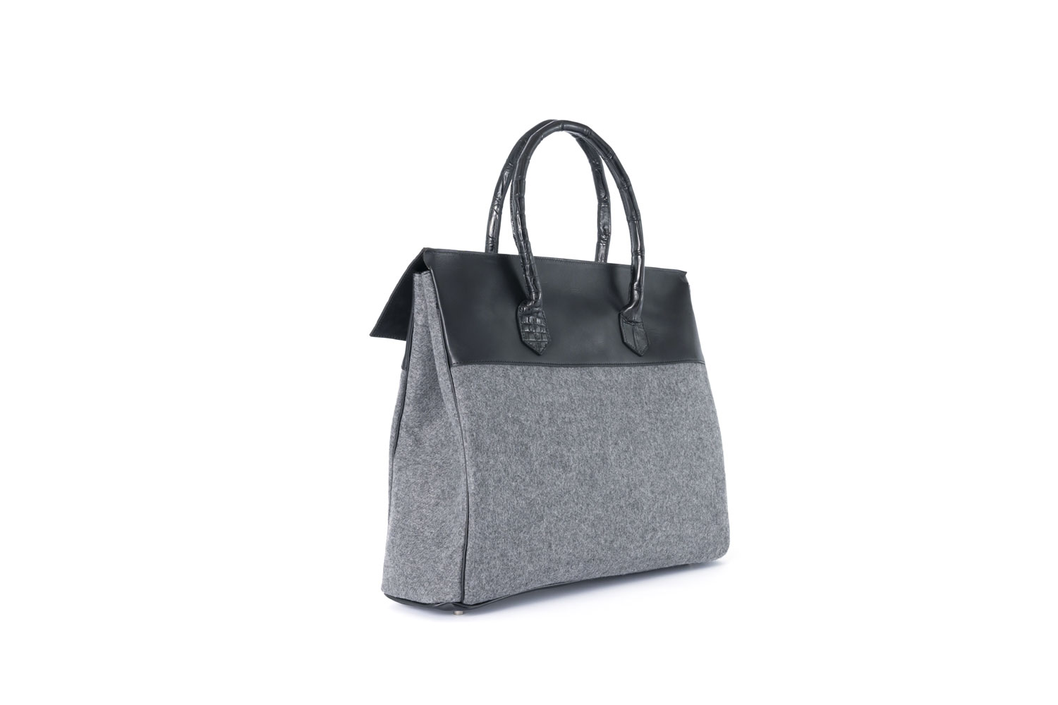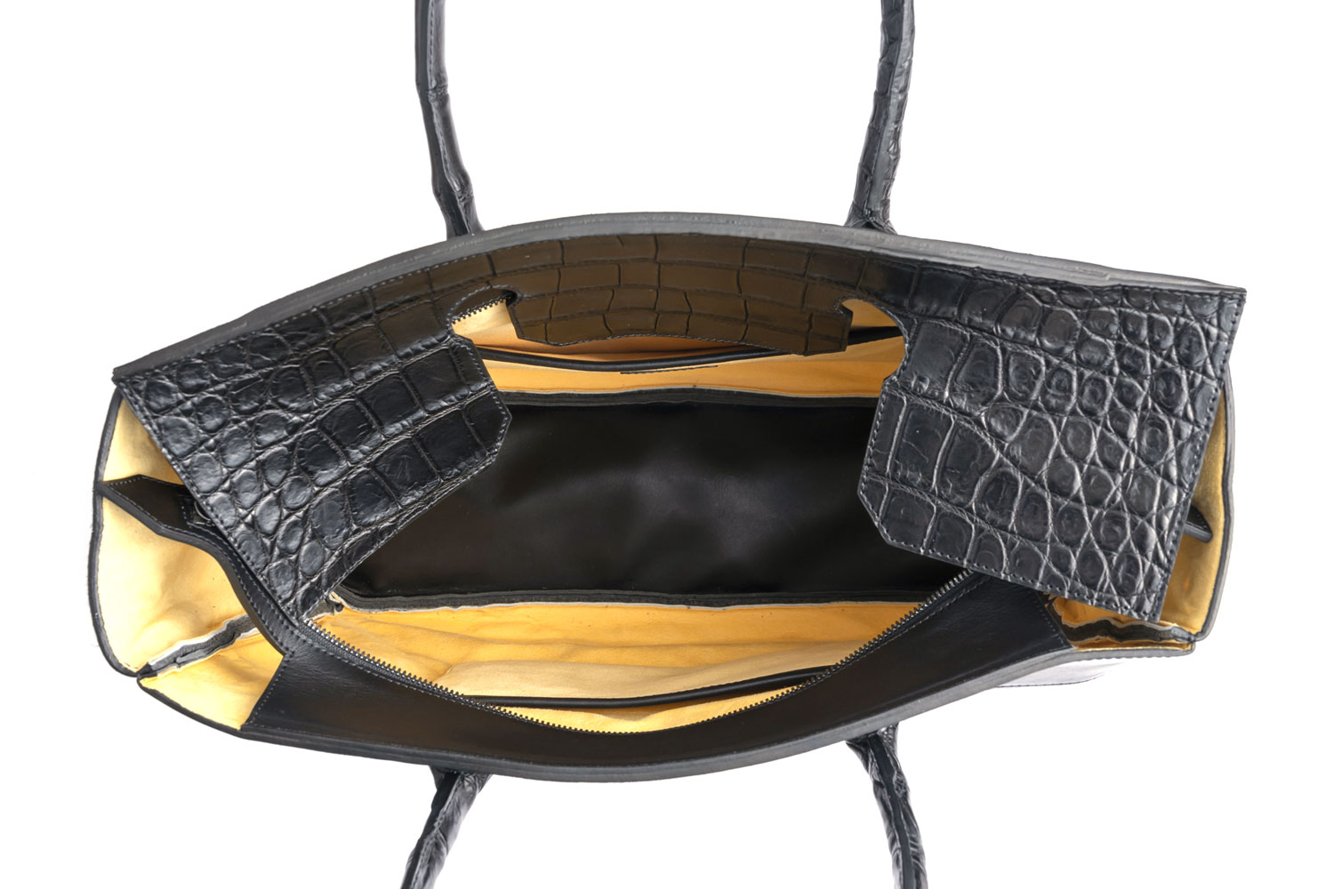 自然体で持てるソフトなトートバッグ。 ナイロンの生地をふんだんに使いその質感が体に触れるたび 心がほぐれる柔らかなトートです。 トップには本革を使用したクロコダイル型押しに、ファスナー付き。 中身には、小物用ポケットが2つ。容量も充分。